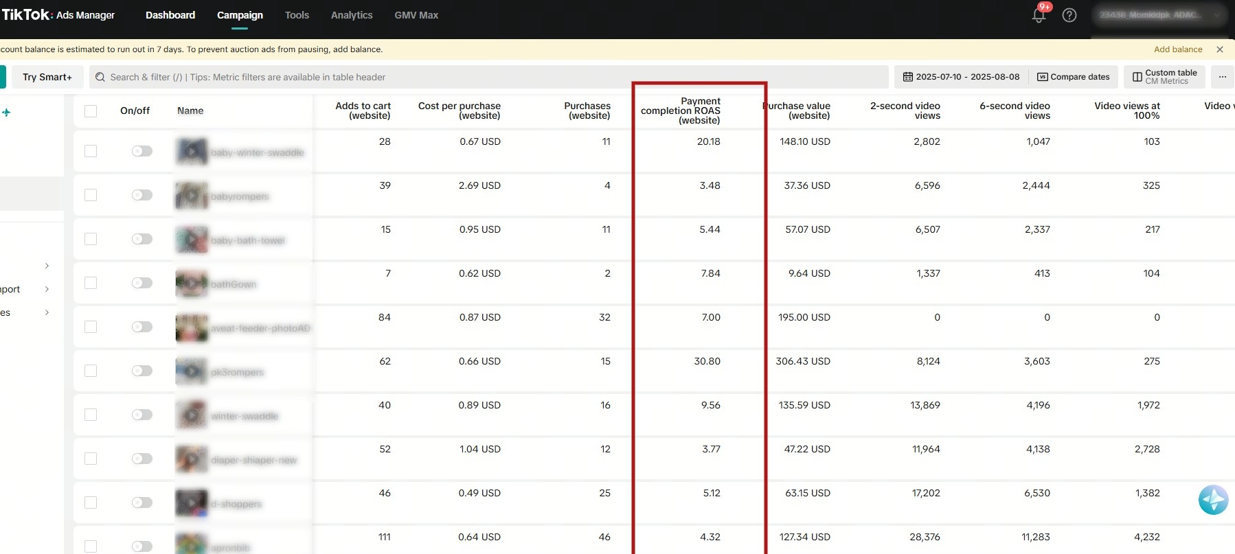 Strategy: Launched 3 ad creatives with trending TikTok audio, optimized for “Add to Cart” in first 72 hours, then shifted to “Purchase” optimization.